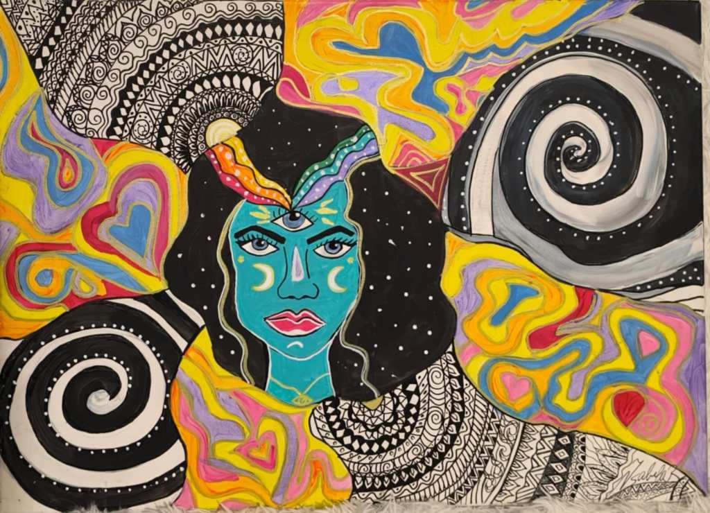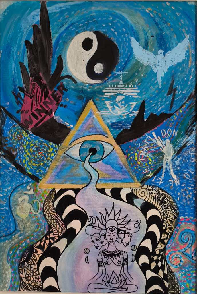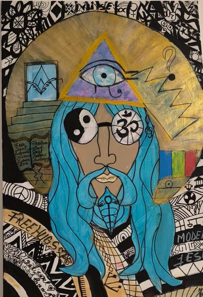 Personajul central – cu barbă și păr albastru ca un fluviu de gânduri – poartă în ochi două simboluri sacre: Yin & Yang și OM, semne ale echilibrului și ale vibrației universale. Privirea sa pare să fuzioneze polarități, să vadă realitatea cu ambele emisfere ale ființei. Deasupra capului, Ochiul conștiinței veghează dintr-un triunghi auriu, străpuns de semne, întrebări, energii. Află mai multe->