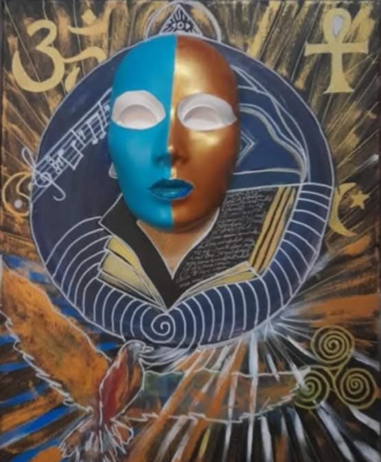 Masca bicoloră, în tonuri de albastru și auriu, reprezintă dualitatea profundă a ființei: raționalul și intuitivul, umanul și divinul, tăcerea și expresia.